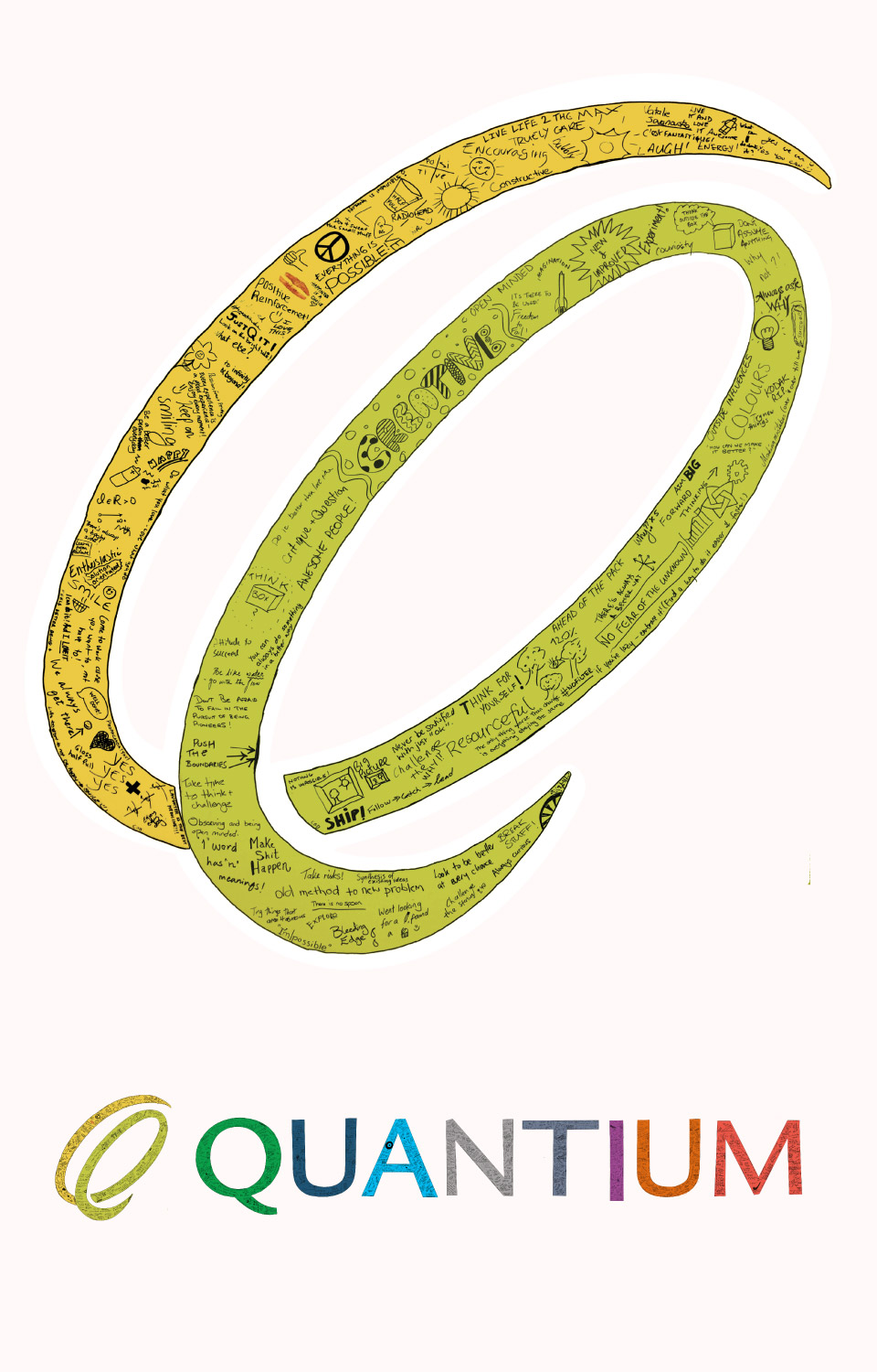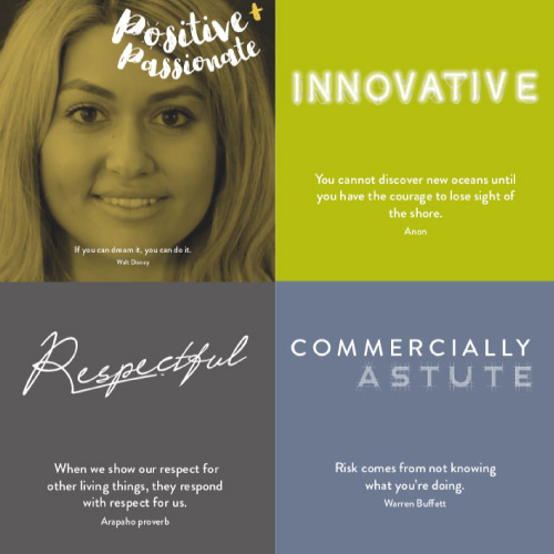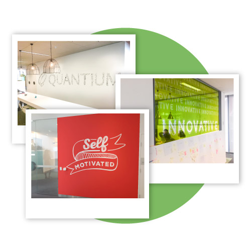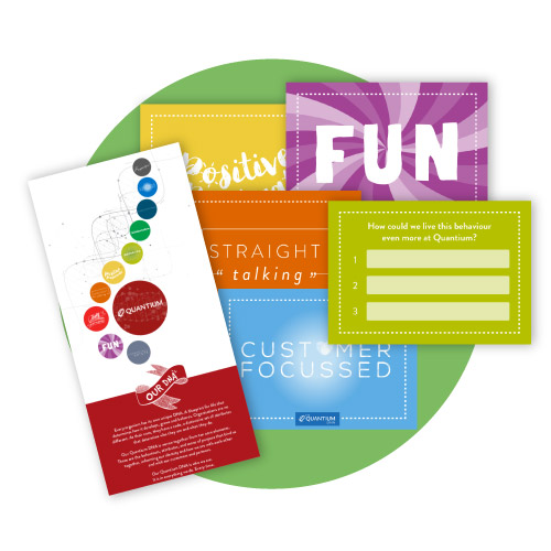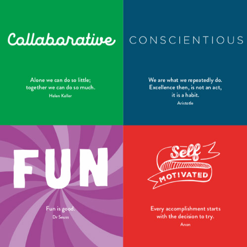 Space making with values is a powerful way to connect teams to what really matters every day. When Quantium approached us to help tell the story of their values, we created an activity for their off-site where giant letters spelling out QUANTIUM became murals. Global team members wrote or drew examples of how they live the values– one per letter, and a different colour for each.